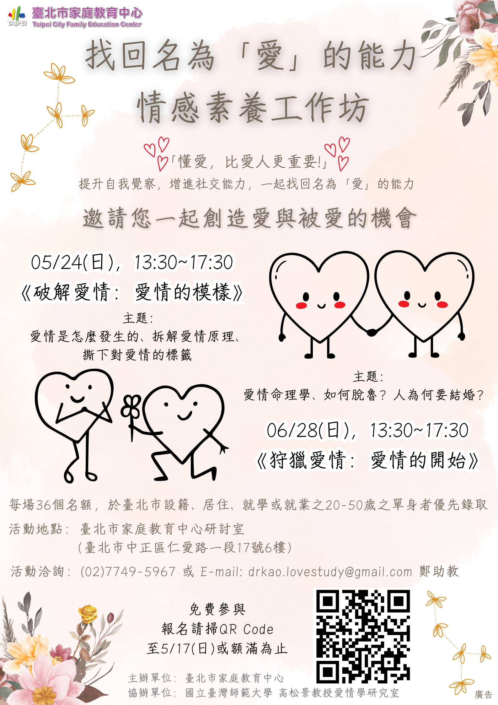 | 公告內容 | 臺北市家庭教育中心115年度『找回名為「愛」的能力—情感素養工作坊』,於5月24日及6月 |