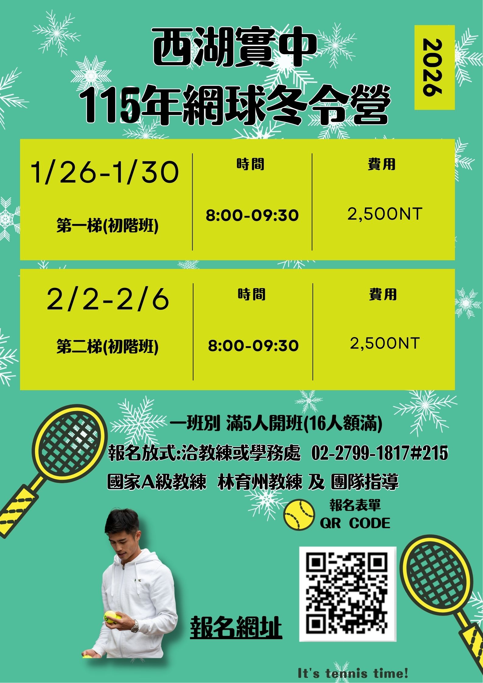 | 公告主旨 | 轉知115年度西湖實驗國民中學網球冬令營活動訊息 |