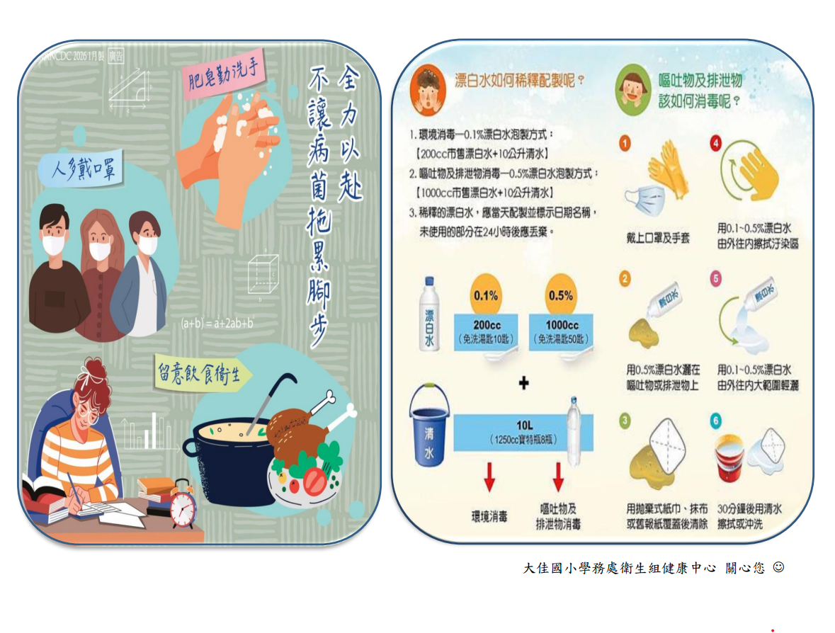 校園公告 公告主旨 防疫小叮嚀~大佳(家)好健康唷! 發佈日期 2026 年 2 月 26 日 發佈單位 衛生組 公告類別 重要宣導 公告等級 無 點閱次數 96 公告內容 114下防疫小叮嚀-家長 114下防疫小叮嚀-家長 檔案名稱檔案大小檔案格式下載114下防疫小叮嚀-家長.pdf922.27 KB新視窗開啟檔案 114下防疫小叮嚀-家長.pdf 相關附件 【2026-02-26】有關我國身心障礙者權利公約(CRPD)第三次國家報告條約專要文件 ... 【2026-02-26】2026年減碳大作戰-校園活動