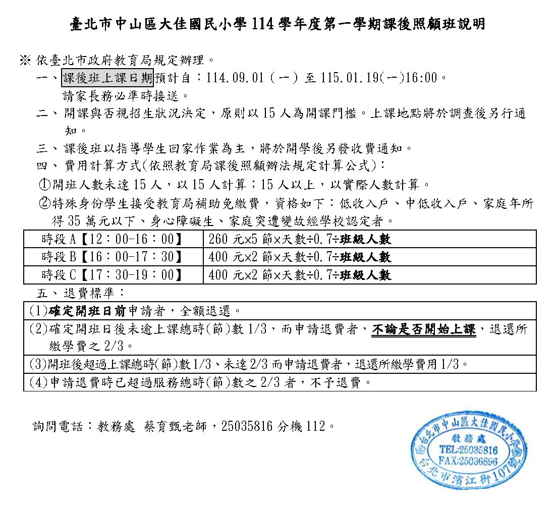 臺北市中山區大佳國民小學114學年度第一學期 一年級課後照顧班 意願調查表 臺北市中山區大佳國民小學114學年度第一學期 二年級課後照顧班 意願調查表 臺北市中山區大佳國民小學114學年度第一學期 三年級課後照顧班 意願調查表 臺北市中山區大佳國民小學114學年度第一學期 四年級課後照顧班 意願調查表 |