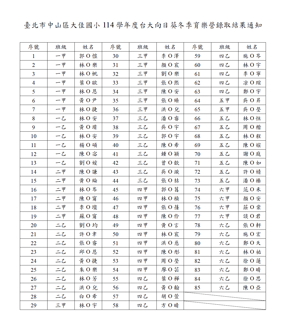校園公告 公告主旨 114學年度台大向日葵冬季育樂營錄取結果通知 發佈日期 2025 年 12 月 29 日 發佈單位 生活教育組 公告類別 重要宣導 公告等級 無 點閱次數 202 公告內容 本次營隊有準時繳交之學生全數錄取,請家長們叮囑學生於115/1/9 (五)完成繳費,感謝各位家長的配合。 相關附件 【2025-12-29】臺北市政府平臺預定114年12月29日(星期一)晚間6時至7時暫停服務 【2025-12-29】轉知114學年度教育盃國民小學桌球錦標賽訊息