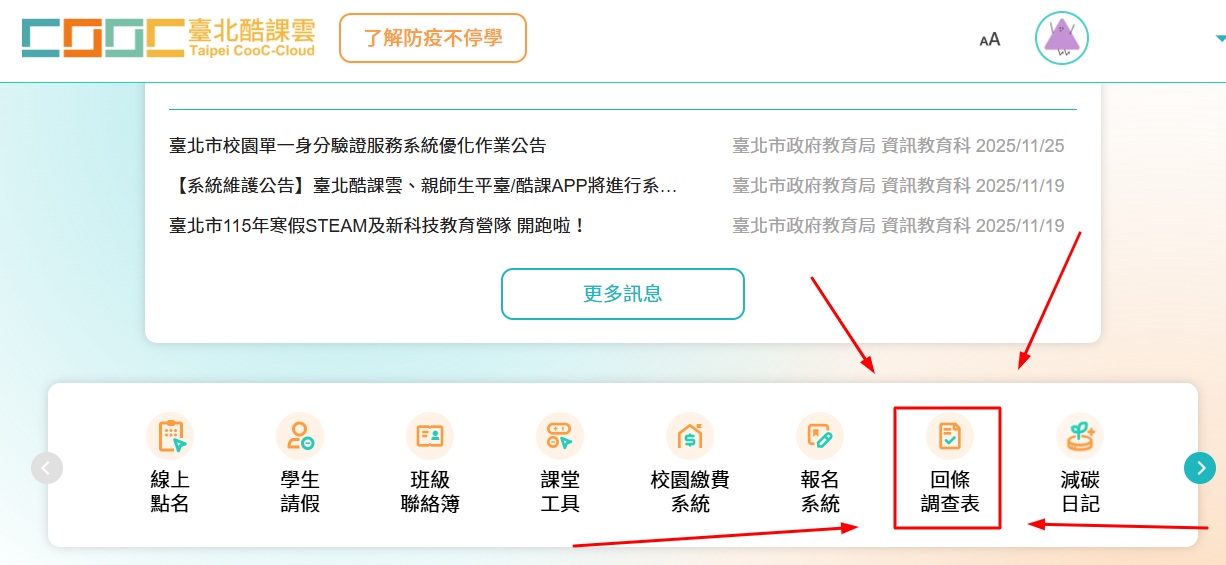 | 公告內容 | 親愛的家長您好: 學校將於114/12/22上午08:00~115/1/2下午23:00進行線上調查,貴子弟於114學年度寒假參與課後照顧班之情形。 ☆☆☆本次調查會以酷課進行調查,請留意表單開放時間☆☆☆ 若有疑問,也請致電(02)25035816-112 蔡老師,感謝! 請於調查期間至『酷課』進行填寫。